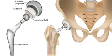 A total hip replacement replaces these surfaces with plastic and metal. The hip end of the femur is replaced with a smooth metal component, which fits into the end of the thigh bone. This articulates with a cup which replaces the socket in the pelvis.